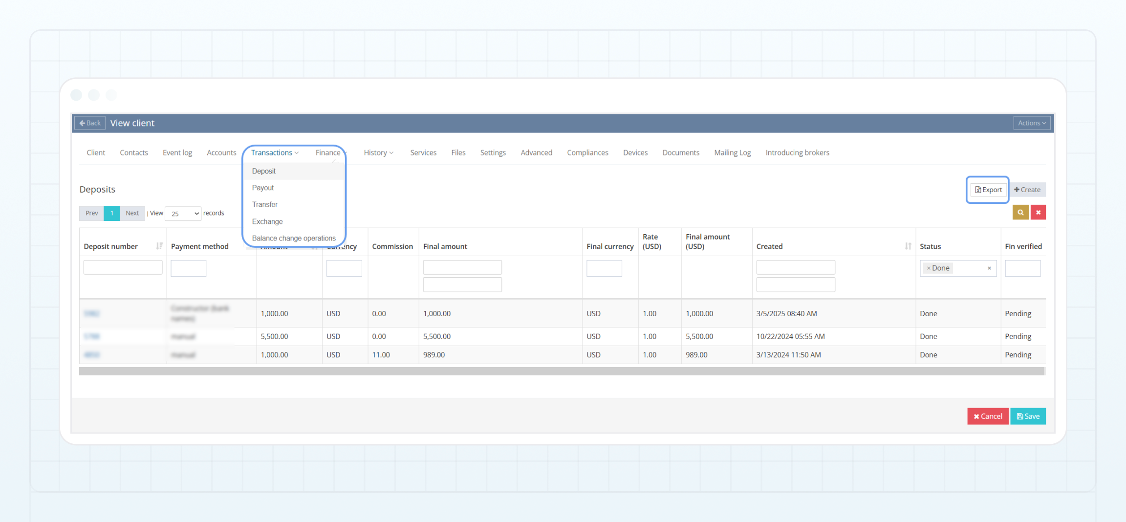 On the client details page, go to the **Transactions** tab, then select **Deposit**, **Payout**, **Transfer**, **Exchange**, or **Balance change operations** from the dropdown to view the respective transactions.